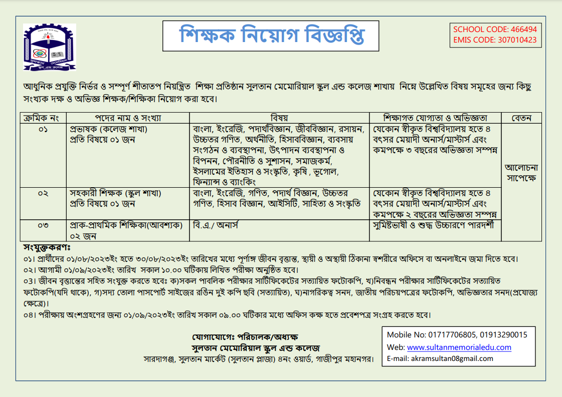 শিক্ষক নিয়োগ বিজ্ঞপ্তি